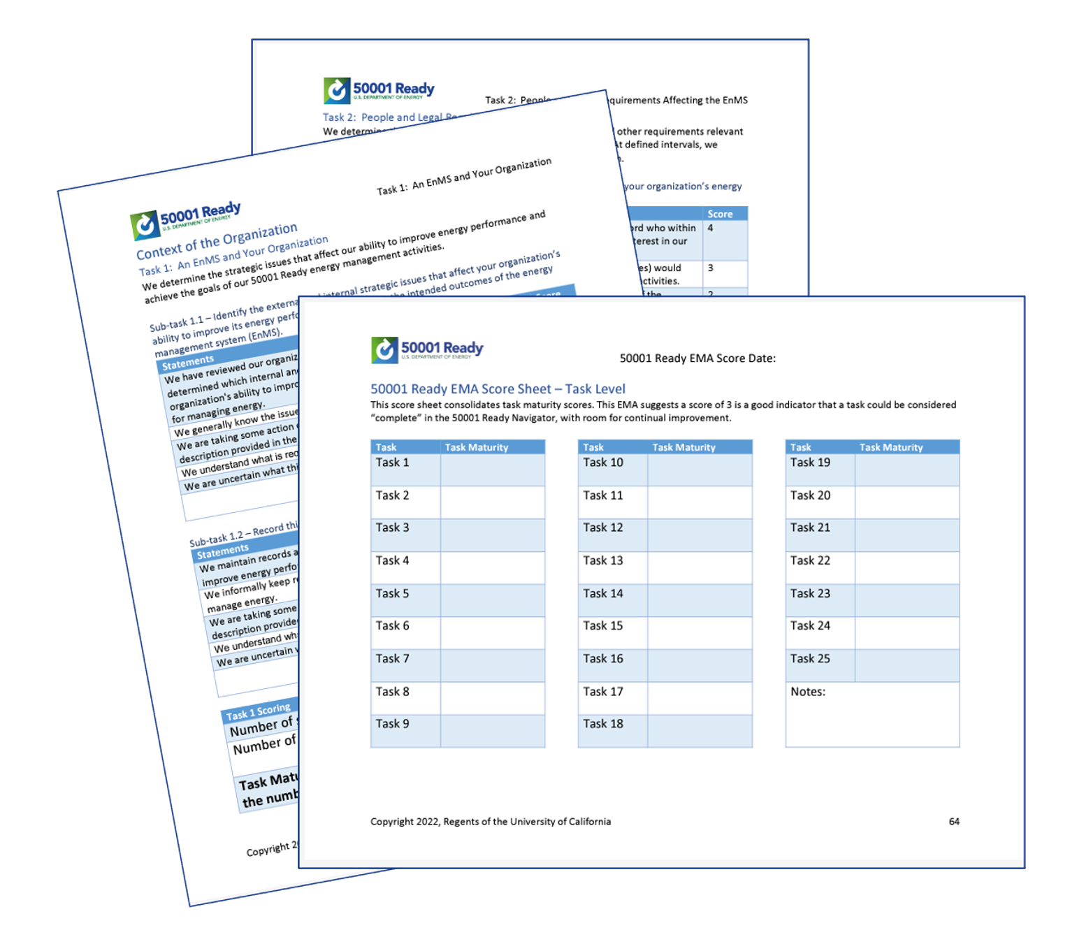 The 50001 Ready EMA is organized by the 7 sections and 25 tasks of the 50001 Ready Navigator. It provides a set of five related statements for each of the 50001 Ready Navigator’s 114 sub-tasks. The sub-tasks are found on the “Getting It Done” tab of each of the 25 Navigator tasks.